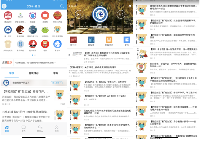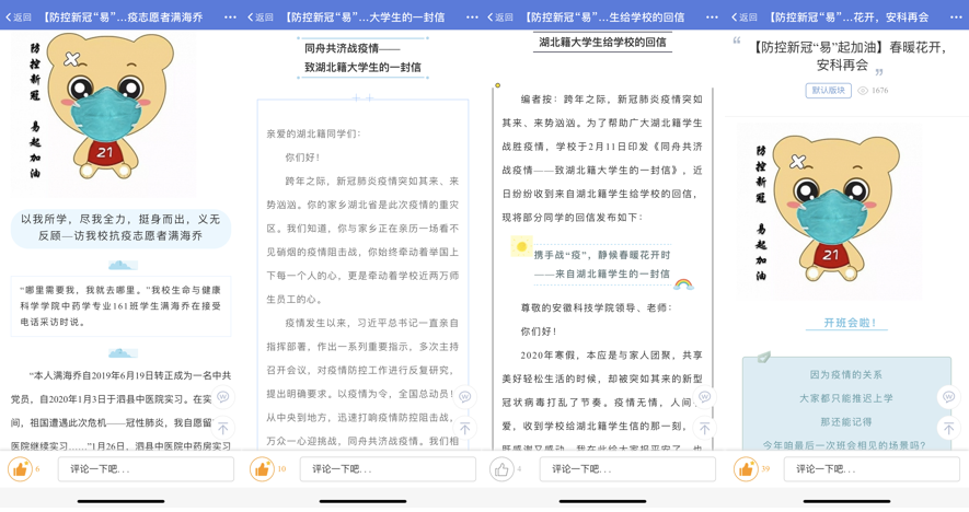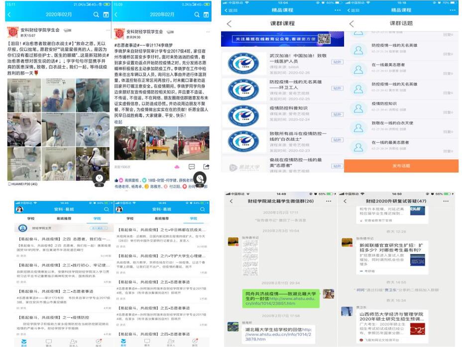 分工协作,“六声”齐发。 财经学院辅导员王天云老师依托“财经易宝之声”,通过易班平台推出“易起奋斗,共战疫情”系列宣传报道,分享相关政策及防控知识,积极宣传参与家乡疫情防控志愿服务的财经学子事迹,充分发挥易班平台优势,全力推进网络思想政治教育,坚定打赢疫情防控阻击战的信心。截至目前,“易起奋斗,共战疫情”系列报道共有7篇上线。 辅导员薛枫依托“学风财经之声”,充分利用学生关注度较高的学生会官方QQ、学风财经微信公众号等平台“及时发声,强化思想引领”,学生会官方QQ、微信公众号发表文章近10篇,浏览量达8400余次。各班级辅导员老师依托“专业班级之声”,充分利用易班平台班级群等载体,学习相关文件精神、落实工作要求。各位担任学生党支部书记的辅导员老师依托“学生党员学生干部之声”,充分发挥学生党员、学生干部模范带头作用,传播正能量。所有专兼职辅导员老师依托“财经辅导员之声”,结合日常工作分工,积极利用易班、微博等,认真思考谋划,通过易班发布系列话题或撰写发布高质量主题博文等,发声引领,唱响财经辅导员之声。学院学生工作负责人依托“学生工作负责人之声”,在财经学院易班微社区,围绕上级和学校文件精神与总体要求积极发声。
