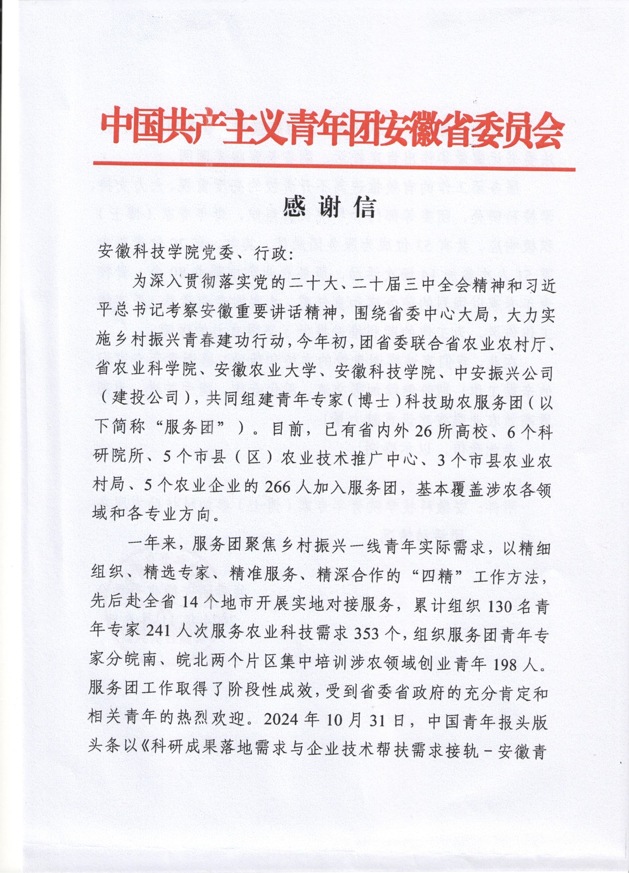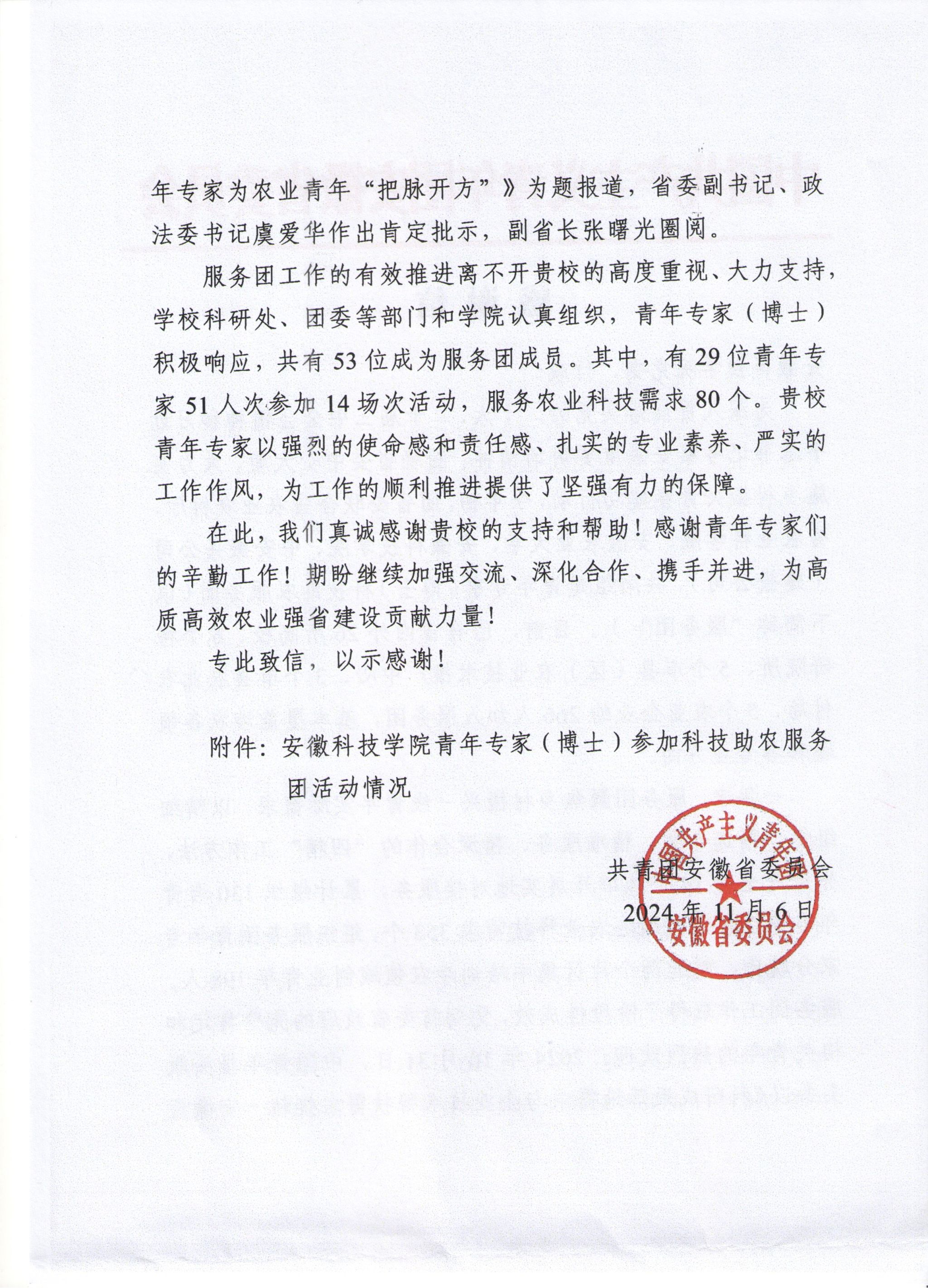 近日,共青团安徽省委员会向开云线上官网_开云(中国)发来感谢信,感谢开云线上官网_开云(中国)青年专家(博士)在科技助农服务团中付出的辛勤工作,并表述期盼继续加强交流、深化合作、携手并进,为高质高效农业强省建设贡献力量。