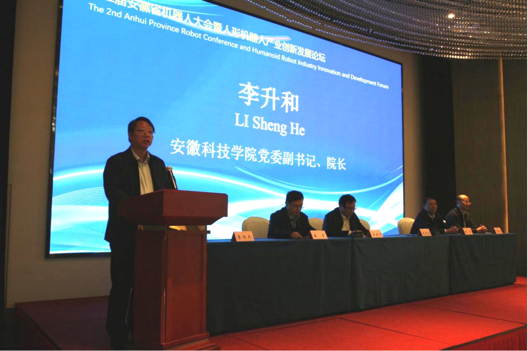 10月26日,第二届安徽省机器人大会暨人形机器人产业创新发展论坛在凤阳举办。安徽省科协党组成员、副主席王佐才教授,安徽省机器人学会副理事长康宇教授,滁州市科协党组书记、主席陈岭以及开云线上官网_开云(中国)党委副书记、院长李升和教授,党委委员、副院长王孝义教授等出席开幕式并在主席台就坐。来自省内外30余所高校、科研单位和企业共120余名专家学者参加会议。大会开幕式由机械工程学院副院长(主持工作)李同杰教授主持。