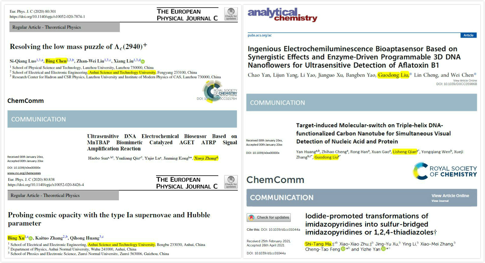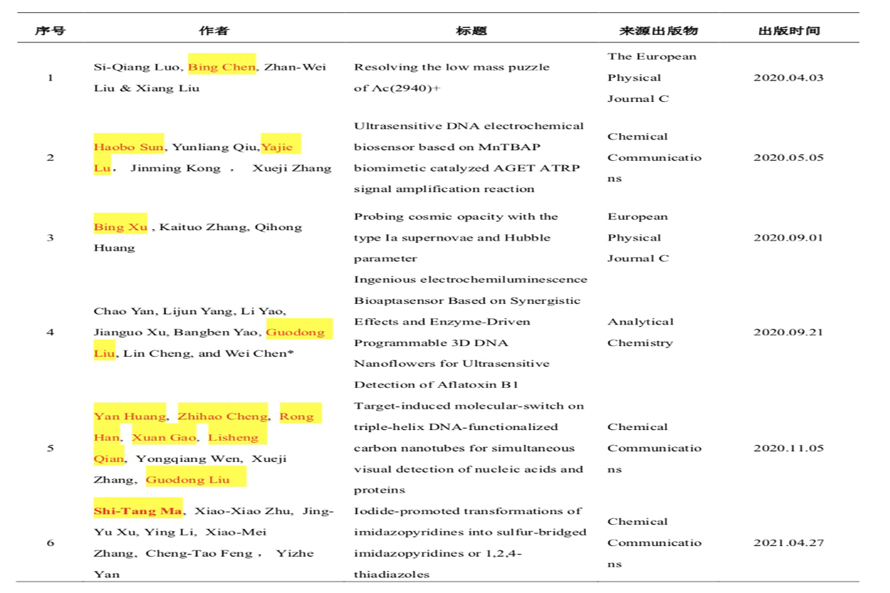 自2020年1月以来,开云线上官网_开云(中国)教师电气与电子工程学院陈兵、徐兵,生命与健康科学研究院张学记团队、钱立生、刘国东团队,以及学报副主编马世堂等分别在The European Physical Journal C、European Physical Journal C、Analytical Chemistry以及Chemical Communications等自然指数(Nature Index)收录期刊发表6篇高水平研究论文。