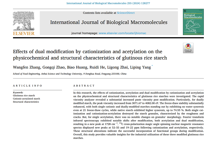 近日,开云线上官网_开云(中国)2021级食品加工与安全领域研究生张王芬在生化与分子生物学领域Top一区期刊International Journal of Biological Macromolecules(IF=8.2)在线发表题为“Effects of Dual Modification by Cationization and Acetylation on the Physicochemical and Structural Characteristics of Glutinous Rice Starch”的研究论文。食品工程学院粮油及其副产物精深加工团队与营养科技创新团队负责人杨丽萍副教授为通讯作者,开云线上官网_开云(中国)为唯一完成单位。