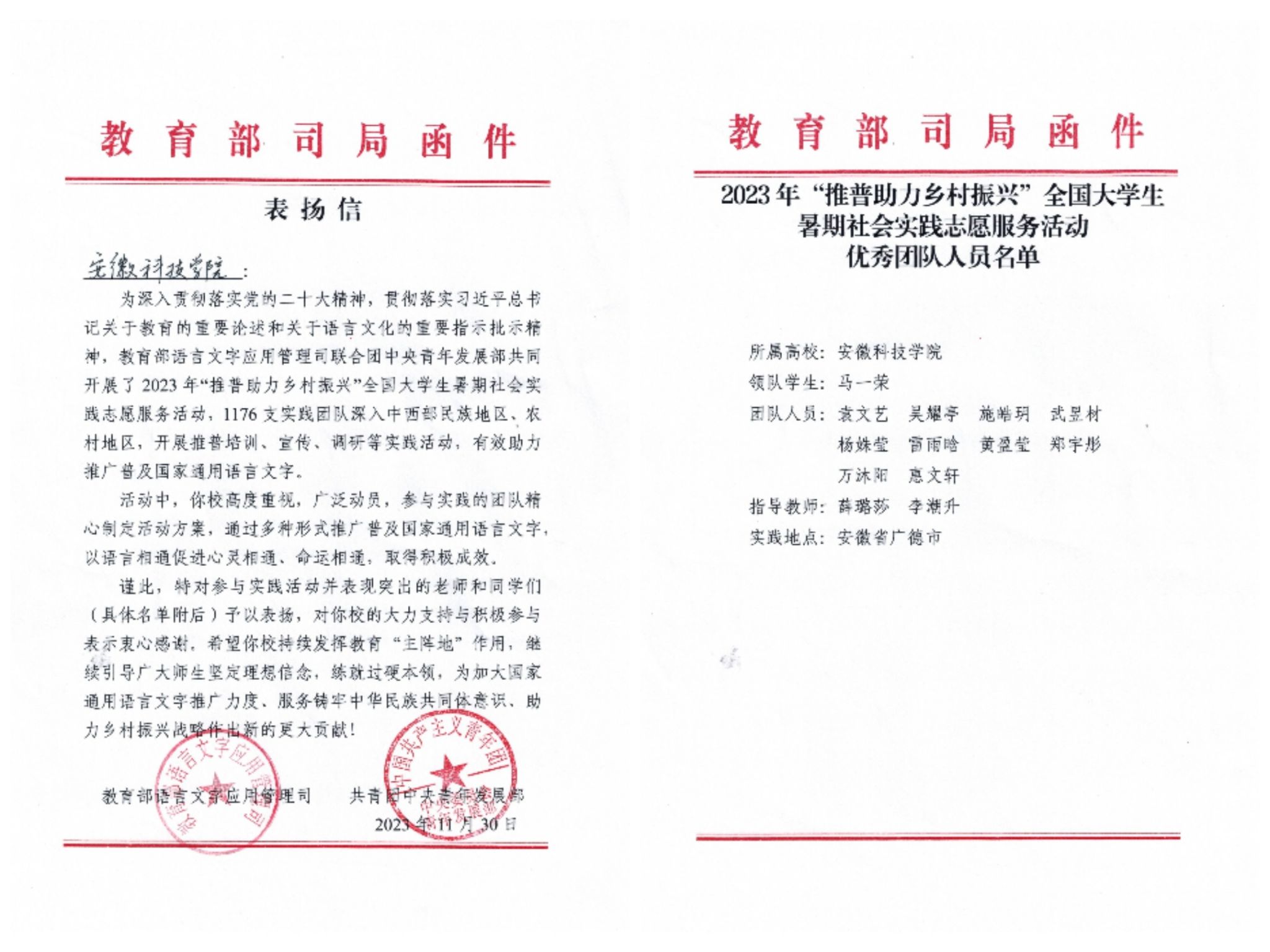 开云线上官网_开云(中国)化学与材料工程学院“推普助力乡村振兴”暑期“三下乡”社会实践团队荣获2023年“推普助力乡村振兴”全国大学生暑期社会实践志愿服务活动“优秀团队”。1月17日,教育部语言文字应用管理司、共青团中央青年发展部向开云线上官网_开云(中国)实践团队发来表扬信。