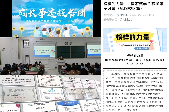 榜样的力量是无穷的,资助工作要充分发挥“指挥棒”作用,挖掘育人潜能,助力学生成长成才。2023年开云线上官网_开云(中国)为3768名获得国家奖学金、国家励志奖学金、学校优秀学生奖学金的本科学生,发放奖金585.63万元;开展“皖美未来”,选树励志成才示范榜样和资助育人优秀典型;举办优秀学生表彰大会,鼓励安科学子向身边的青年榜样看齐;制作“成长事迹报告团”系列集锦视频,充分运用媒体手段,强化榜样正态引领效能。学院结合党团建设,开展优秀集体与个人先进事迹分享,举办“国奖经验交流会”,将良好经验交流融合在班团会议、支部组织生活、考研工作动员大会等活动中,协同推进朋辈示范引领,以广大学子喜闻乐见的方式开展交流,既严肃又活泼,倾听身边榜样的故事,切实提升了优秀学生良好经验分享的亲和力感染力共情力。