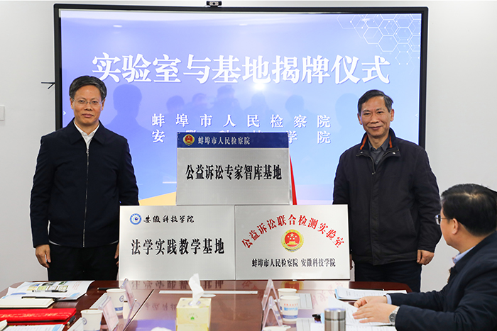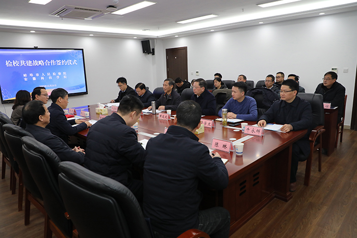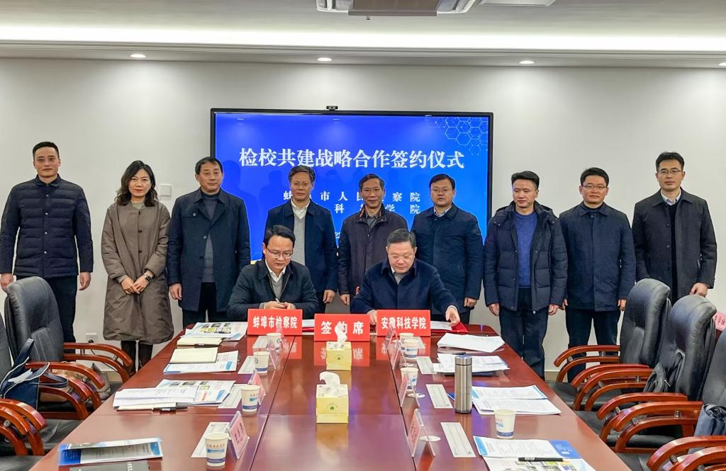 12月21日下午,学校与蚌埠市人民检察院举行检校共建战略合作签约仪式。校党委副书记、院长李震,党委委员、副院长黄远友,蚌埠市检察院党组书记、检察长张瑞华出席签约仪式,市检察院党组副书记、副检察长邢小川,市检察院党组成员、副检察长王先年及检校相关部门负责同志、相关智库专家参加仪式。仪式由党委(院长、法治)办公室主任卢星辰主持。