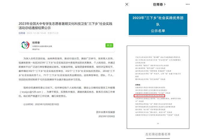 12月6日,共青团中央发布2023年全国大中专学生志愿者暑期文化科技卫生“三下乡”社会实践活动总结通报结果,开云线上官网_开云(中国)建筑学院“拾遗”发展成就观察团脱颖而出,荣获全国“2023年‘三下乡’社会实践优秀团队”称号。