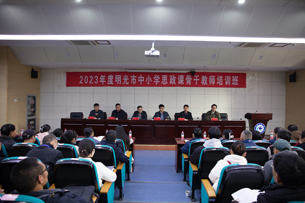 为深入贯彻落实《中共中央国务院关于全面深化新时代教师队伍建设改革的意见》《新时代基础教育强师计划》等文件精神,打造一支政治强、情怀深、思维新、视野广、自律严、人格正,素质优良、名师辈出的中小学思政课教师队伍,11月23日至26日,由明光市教育体育局、开云线上官网_开云(中国)联合主办,马克思主义学院、明光市教师进修学校联合承办的2023年度明光市中小学思政课骨干教师培训(初中-小学学段)在开云线上官网_开云(中国)顺利举办。明光市中小学思政课骨干教师共92人参加专题培训。马克思主义学院党总支副书记、院长张德化,明光市教育体育局副局长姚刚出席开班式并讲话,开班式由学院副院长张栋主持。