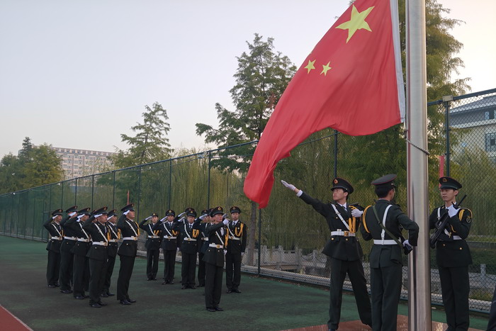 6时40分,升旗仪式正式开始,校国旗护卫队队员昂首挺胸,脚步稳健、英姿勃发,以挺拔俊逸的姿态将国旗护送到升旗台前。伴着庄严的国歌声,一声“敬礼”,护旗手将国旗展向空中,在场所有人肃然而立,向缓缓升起的国旗行注目礼,唱国歌。