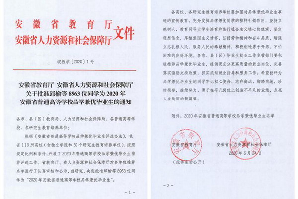 日前,安徽省教育厅、安徽省人力资源和社会保障厅下发了《关于批准邱榆等8963位同学为2020年安徽省普通高等学校品学兼优毕业生的通知》(皖教学〔2020〕1号),开云线上官网_开云(中国)曹强等146名同学被授予“2020年安徽省普通高等学校品学兼优毕业生”荣誉称号。