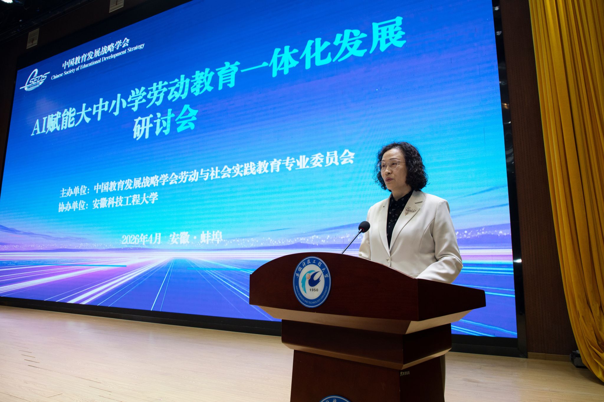 4月18日上午,研讨会正式开幕。开幕式由中华职教社原党组书记、总干事方乃纯主持。校党委书记时伟在欢迎辞中介绍了学校76年办学历程、应用型办学定位与劳动教育特色实践,表示学校将与各界携手推动劳动教育高质量发展。安徽省教育厅二级巡视员周晓芹介绍了安徽省劳动教育与 AI 融合应用的推进成效,就深化理论研究、强化学段协同、夯实师资保障等方面提出要求。中国教育发展战略学会常务副会长兼秘书长柯春晖强调要坚守育人初心、深化一体化建设、强化协同共建,共同打造可复制可推广的实践样板。