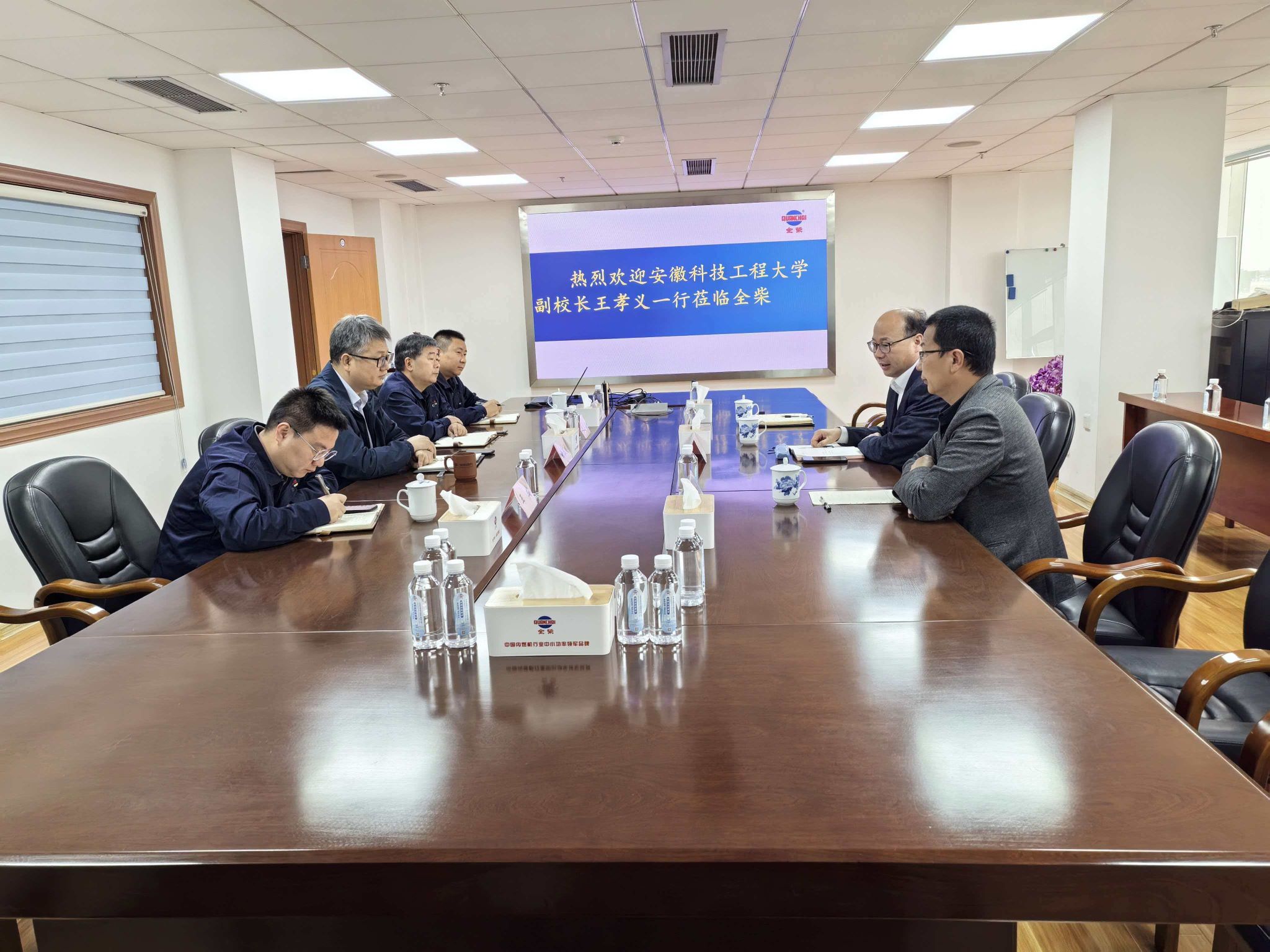 安徽全柴动力股份有限公司董事长徐玉良等热情接待了王孝义一行;座谈期间,王孝义简要介绍了学校基本情况、办学特色、人才培养等情况,希望校企在科研平台联合申报、科研项目联合攻关和人才供给等方面深入合作,进一步提升学校服务地方企业的空间,引进企业优质资源服务人才培养。