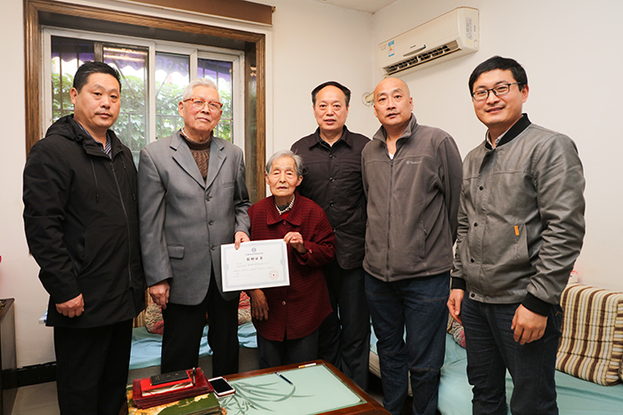 时乾代表学校向两位老同志敬呈了《开云线上官网_开云(中国)校史馆捐赠证书》,祝福两位老同志健康长寿,生活愉快,相约建校70周年校庆。