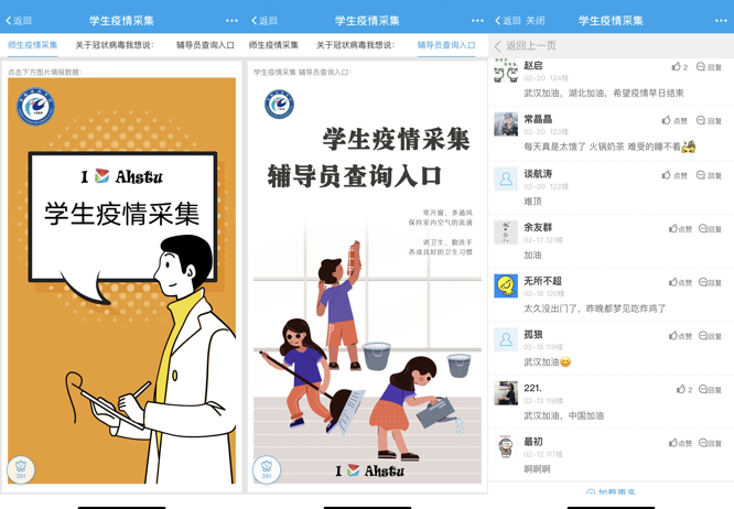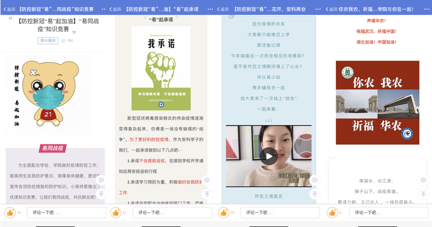 发挥网文及新媒体产品思政功能。制作《你农我农,祈福华农》《白衣战士》等原创帖讲述安科人在这场抗击疫情大战里的暖心故事和美好祝愿。发动辅导员利用挥易班博文功能,围绕爱国主义教育、生命教育、社会责任感教育、规则教育、爱与感恩教育等积极撰写网文。制作《抗击肺炎武汉加油、湖北加油》《辅导员喊你停课不停学》等短视频,积极宣传好新时代青年众志成城、扶危济困、无惧无畏、乐观向上的精神。
