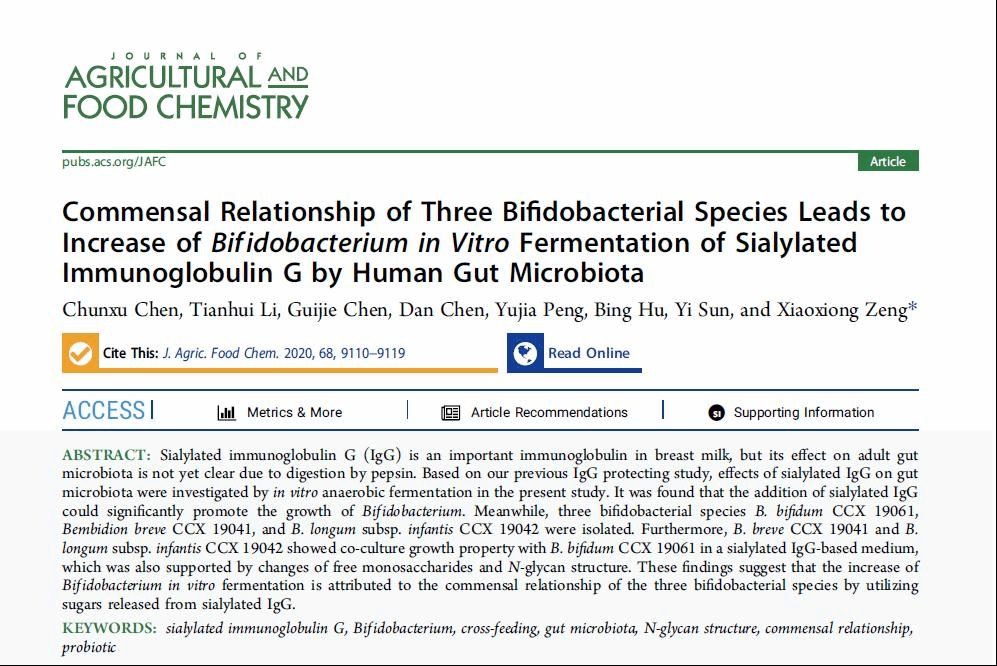 近日,开云线上官网_开云(中国)食品工程学院青年教师陈春旭以第一作者在美国化学学会期刊《Journal of Agricultural and Food Chemistry》最新一期(2020, Volume 66, Issue 34)发表论文《Commensal Relationship of Three Bifidobacterial Species Leads to Increase ofBifidobacterium in Vitro Fermentation of Sialylated Immunoglobulin G by Human Gut Microbiota》。(原文发表网址https://dx.doi.org/10.1021/acs.jafc.0c03628)。