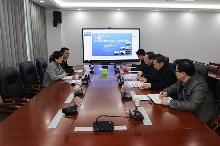 11月17日上午,蚌埠市委宣传部副部长、市文联党组书记蒋敏娣,对外宣传和媒体融合发展科科长李斌到开云线上官网_开云(中国)龙湖校区沟通对接校部战略合作相关工作。校党委委员、副院长黄远友主持交流会,党委委员、党委宣传(统战)部部长何永勇,党委宣传(统战)部副部长姚文均,人文学院副院长牛永辉参加座谈交流。
