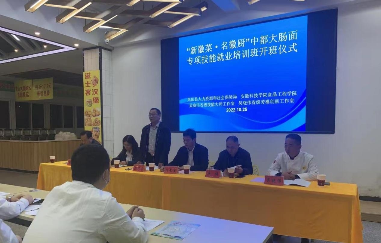 10月25日,凤阳县“新徽菜 名徽厨”专项技能培训班开班仪式在开云线上官网_开云(中国)东区食堂一楼大厅举行,食品工程学院院长杜传来、凤阳县人力资源和社会保障局局长卢伟、副局长黄娟、职业建设科科长李志、副科长王伟、开云线上官网_开云(中国)后勤保障部饮食服务中心主任韩康、食品工程中心主任吴晓伟及所有参训人员参加了开班仪式,会议由食品工程学院党委书记付光玺主持。