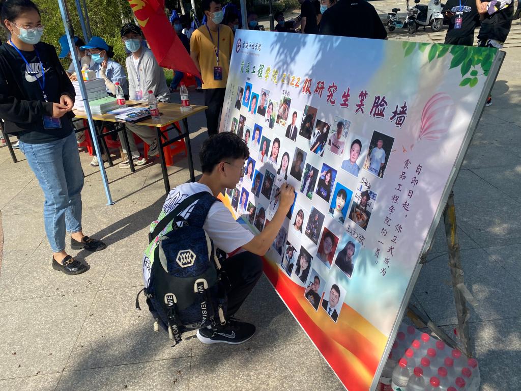 报到现场,食品工程学院竖立起的2022级研究生笑脸墙吸引了大量学生的注意,来校报到的学生纷纷到笑脸墙上找到自己的笑脸照片,签字留影。据了解,暑假期间食品工程学院联系了该院全体2022级研究生,用所有同学的微笑照片,共同完成了笑脸墙。动物科学学院为来校报到研究生悉心准备了迎新大礼包,学院院徽logo定制的米白色帆布袋,里面装着晨光文具与温氏酸奶,为新生送上入学后第一份温暖的礼物,也是对研究生未来科研学习生活的美好祝愿。