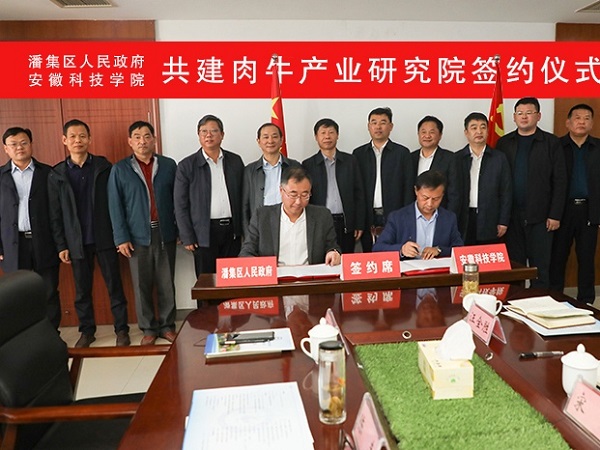 陈丰、闪健分别代表校地双方签署《开云线上官网_开云(中国)潘集区人民政府共建肉牛产业研究院合作协议》。