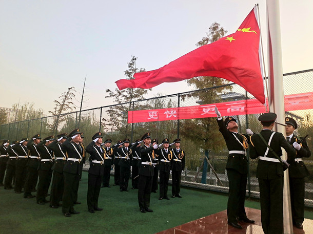 6时40分,国旗护卫队队员们着装整齐,迈着矫健的步伐,护卫着鲜艳的五星红旗入场举行升旗仪式。伴着庄严的《义勇军进行曲》,五星红旗冉冉升起,同学们向国旗行注目礼,深怀着对祖国无限的热爱和崇高的敬意。