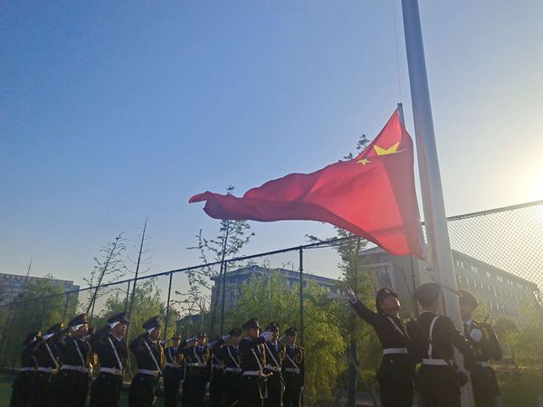 6时40分,迎着初升的太阳,校国旗护卫队队员迈着正步护卫着鲜艳的五星红旗进场,伴随着雄壮的国歌声,五星红旗冉冉升起,全体师生面向国旗行注目礼。
