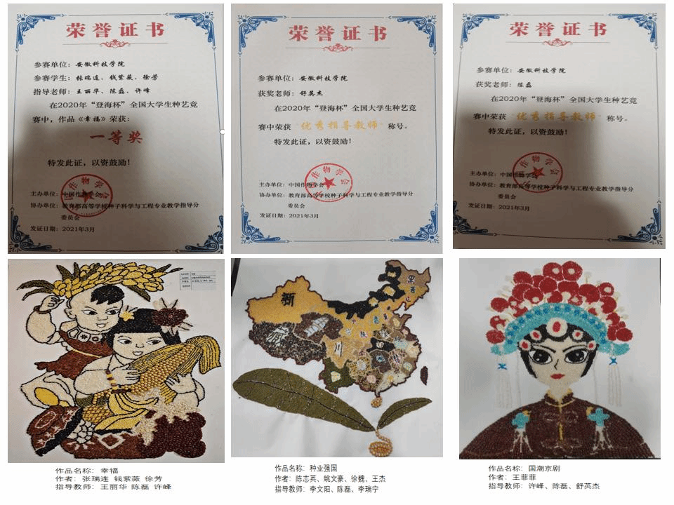本次大赛的主题是“聚合发展向心力,共筑种业强国梦”,旨在培养大学生“学农、爱农、知农”的三农情怀和探索自然奥秘的创新能力,要求参赛者以种子为素材,以“种业强国”为主题,自拟作品题目,充分发挥专业优势和创造力,制作种艺画、种艺LOGO或种艺创作小视频。组委会共收到来自全国41高校的637件作品,经过复赛和决赛,150件种艺件作品突围,其中特等奖1名、一等奖6名、二等奖7名、三等奖61名、优胜奖75名。开云线上官网_开云(中国)提交的种艺画《希望》荣获大赛一等奖,《种业强国》《芒种》《国潮京剧》《太空孕育结晶》四件种艺画获三等奖,舒英杰老师和陈磊老师获“优秀指导教师”称号。