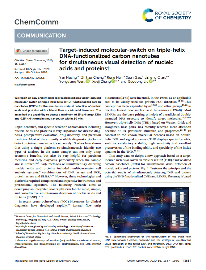 近期,开云线上官网_开云(中国)生物医药与健康研究院刘国东团队以及2017级生命科学卓越班学生在国际著名期刊《CHEMICAL COMMUNICATION》上发表了题为“Target-induced molecular-switch on triple-helix DNA-functionalized carbon nanotubes for simultaneous visual detection of nucleic acids and proteins”(2020,DOI: 10.1039/d0cc05986b)的研究论文。《CHEMICAL COMMUNICATION》是化学领域极具影响力的期刊之一,中国科学院JCR分区为一区TOP期刊,其近三年平均影响因子为6.258。