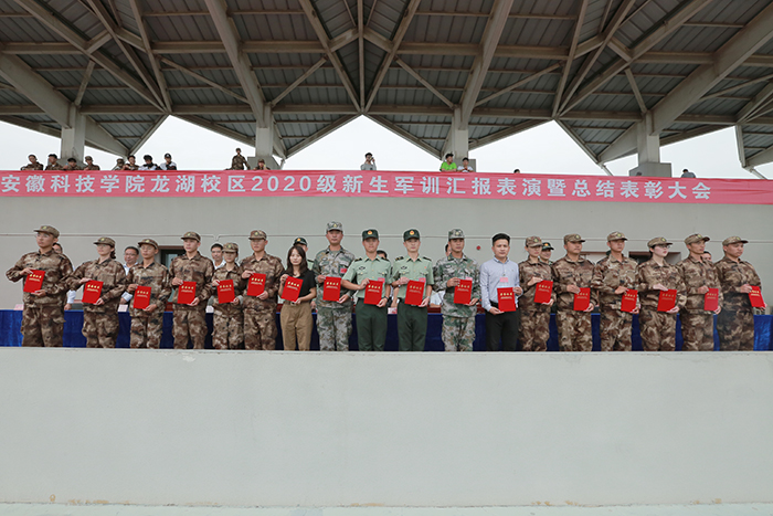 表彰大会上,韦文联代表学校向陆军装甲兵学院蚌埠校区教练勤务营赠送了锦旗。党委学工部部长、学生处处长、军训团政委何永勇同志宣读了表彰决定,与会领导为军训先进集体和先进个人代表颁发了荣誉证书。