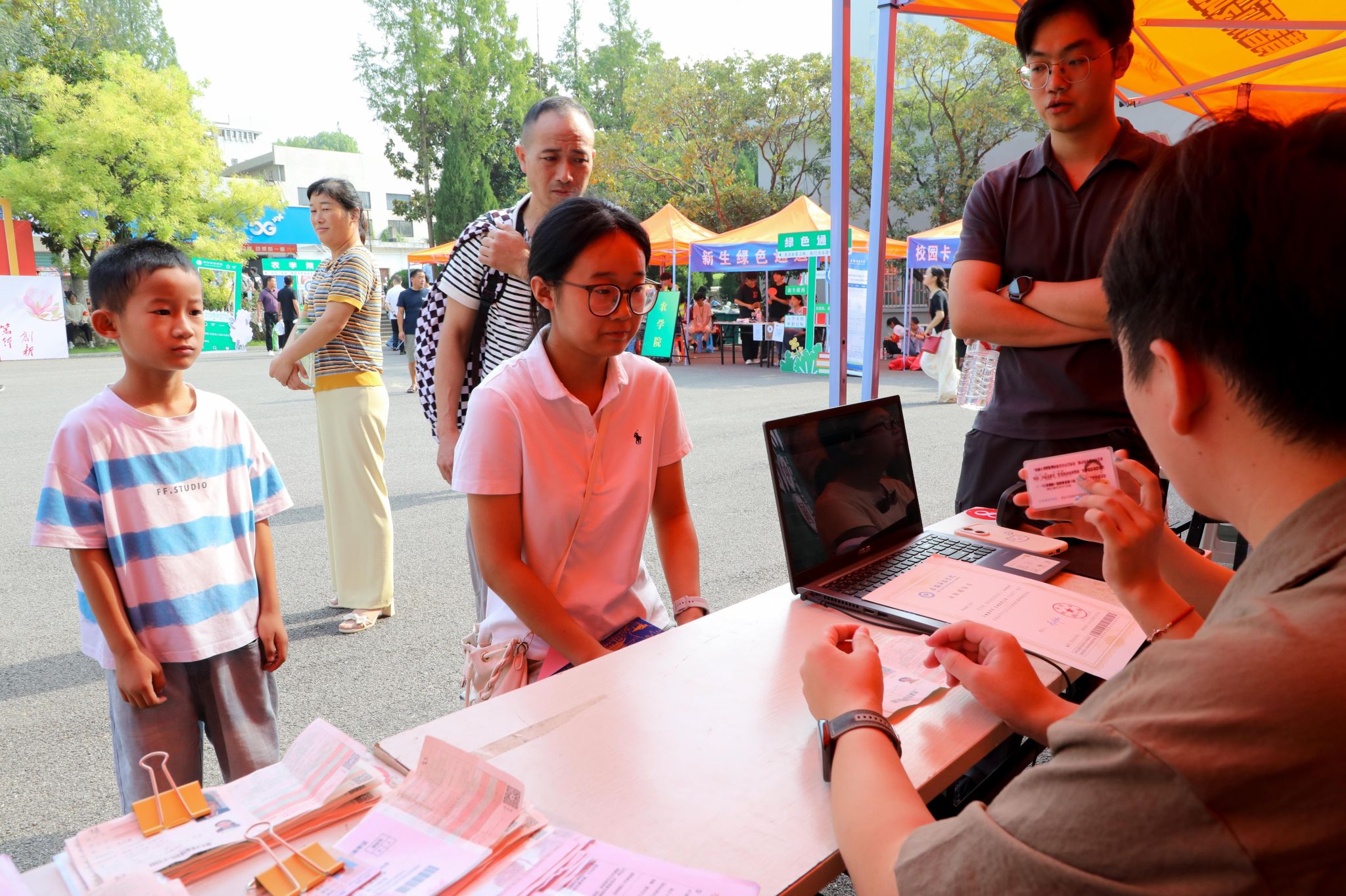 迎新现场,气氛热烈而有序。各学院接待点标识明确,工作人员业务熟练,态度亲切,高效办理各项入学手续。众多的学生志愿者组成一道亮丽的风景线,他们热情引导、答疑解惑、搬运行李,用真诚的服务消解了新生的陌生与不安,传递着安科大家庭的温暖与情谊。校园内还设置了多个创意打卡点、主题展板和特色互动区,各学院结合专业特色布置了多彩多样的展示项目,既有创意又显用心,引来众多新生及家长驻足合影。