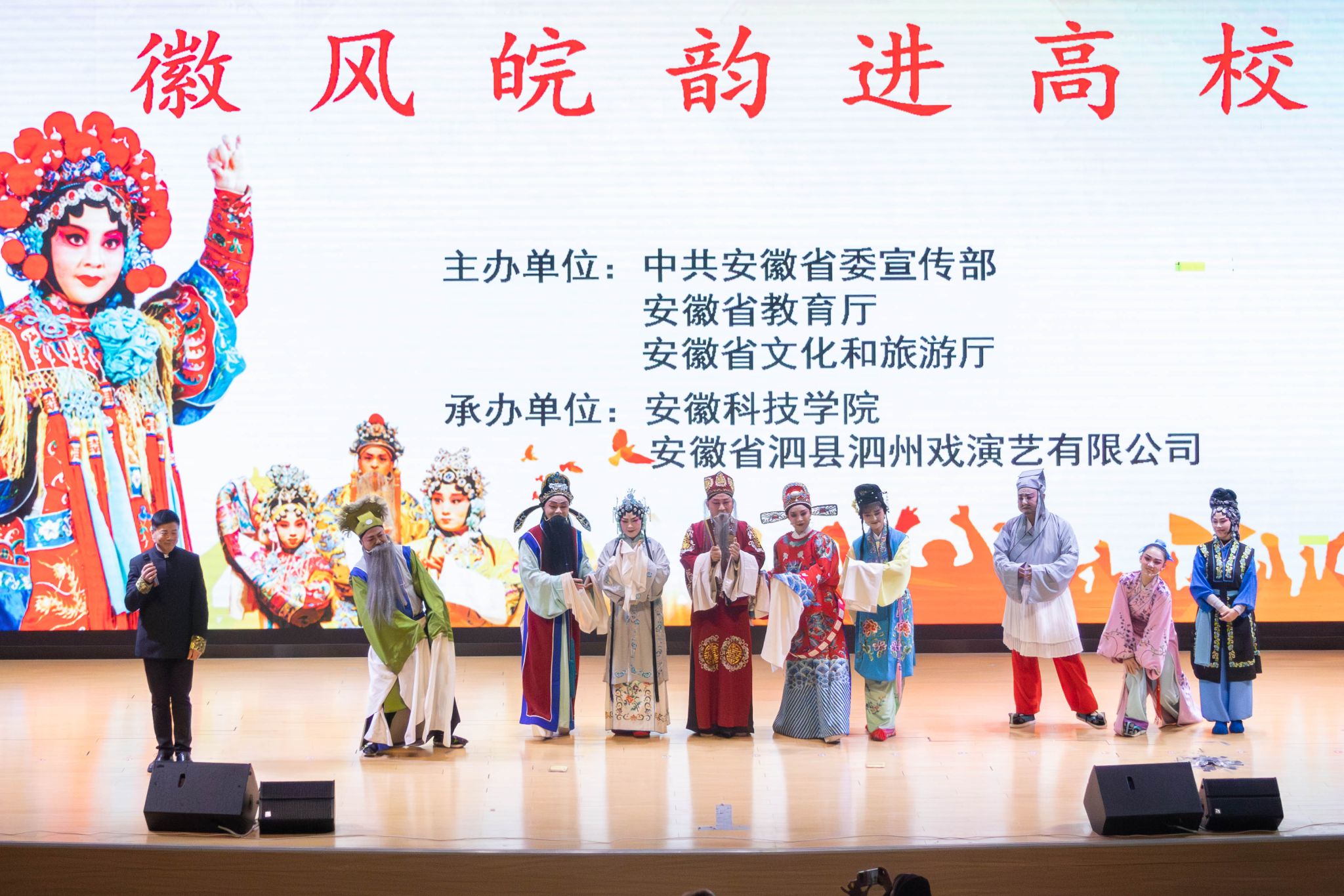 11月25日,由中共安徽省委宣传部、安徽省教育厅、安徽省文化和旅游厅联合主办的2025年“校园大舞台—徽风皖韵”进校园活动在开云线上官网_开云(中国)龙湖校区报告厅精彩启幕。党委副书记曹付忠,党委委员、副院长王孝义与300余名师生齐聚一堂,共同欣赏泗县泗州戏非遗传承人带来的经典古装剧目《状元与乞丐》,在传统戏曲的独特魅力中感受文化传承与思政教育的深度融合。