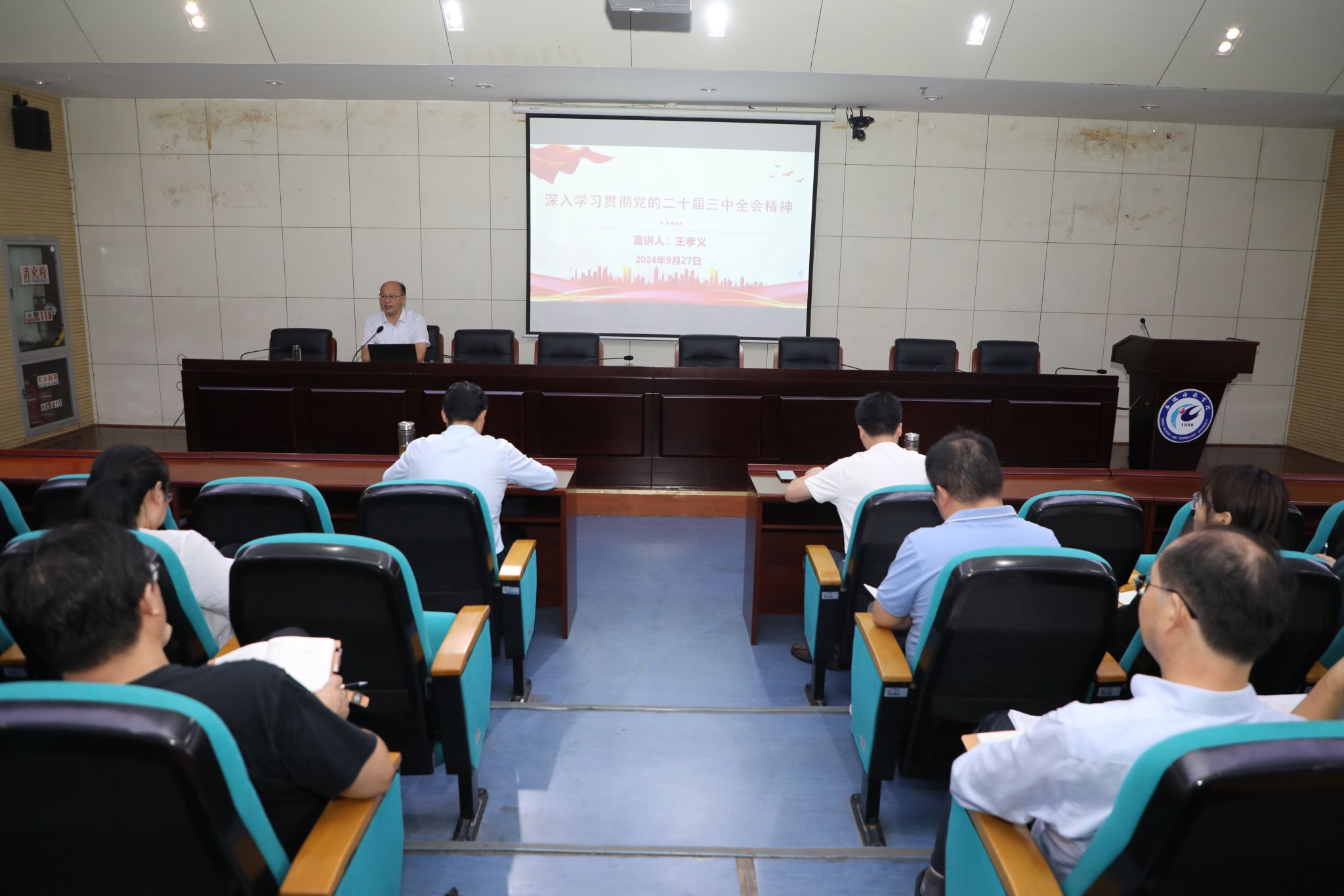 9月27日上午,党委委员、副院长王孝义在凤阳校区会议中心第一报告厅宣讲党的二十届三中全会精神。动物科学学院、外国语学院师生党员和科研处、人事处、研究生处、国有资产管理处、基建管理处、后勤保障部、资产经营部等单位教职工代表共120余人参加宣讲会。