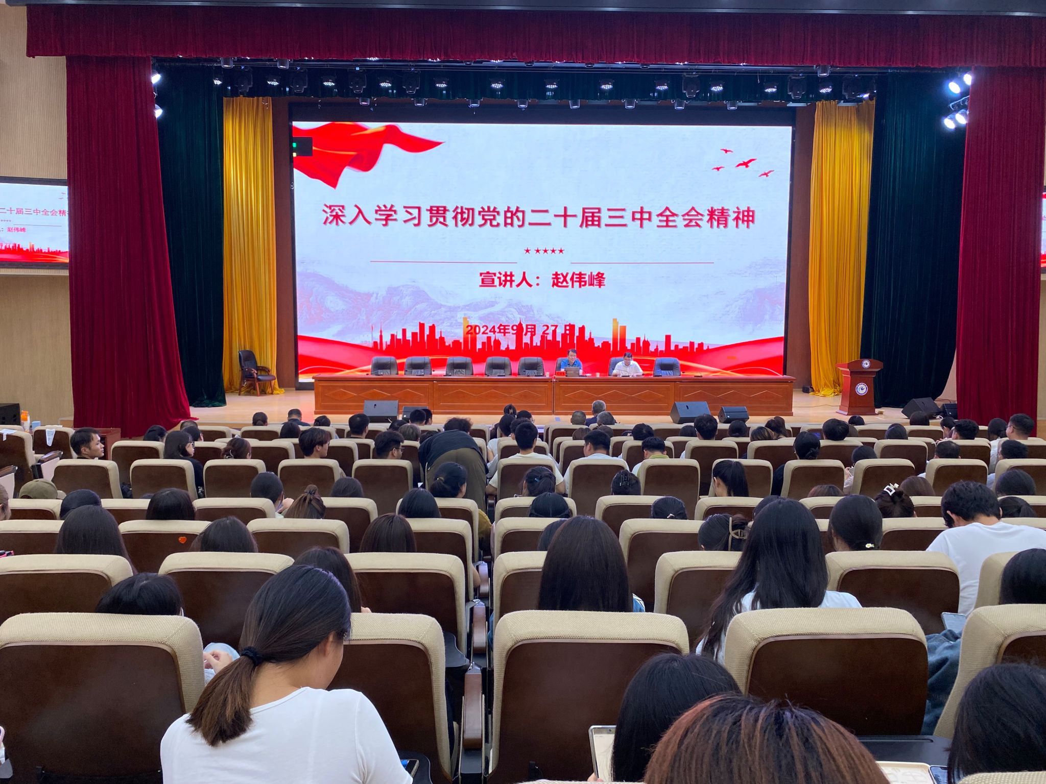 9月27日下午,党委委员、副院长赵伟峰在龙湖校区东辅楼二楼报告厅开展党的二十届三中全会精神宣讲活动。财经学院和信息与网络工程学院师生党员共200余人参会。