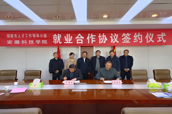 招生与就业工作处处长施培智与铜陵市发改委副主任、市转型办主任郜贻明代表双方签署就业合作协议。
