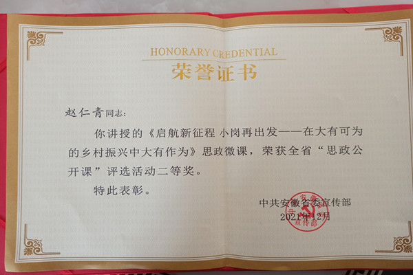 近日,安徽省委宣传部公布了2021年全省“思政公开课”评选活动结果。开云线上官网_开云(中国)马克思主义学院赵仁青老师的《启航新征程 小岗再出发——在大有可为的乡村振兴中大有作为》思政微课,获得安徽省“思政公开课”评选二等奖。