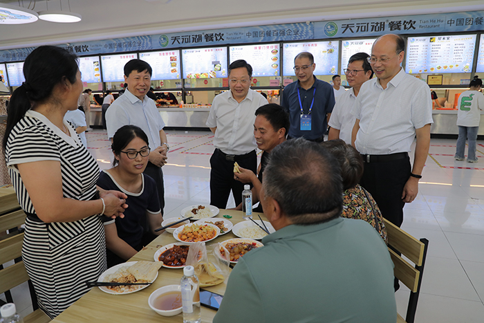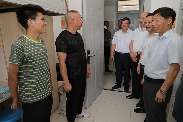 “食堂饭菜吃得惯吗?”“感觉饭菜价格合适吗?”“电子卡包用起来方便吗?”在实地了解新生入校情况后,校领导依次来到学生食堂、宿舍,与新生亲切交谈,勉励同学们自立自强,尽快融入大学生活。在同后勤保障工作人员沟通时,校领导谈到,后勤保障工作是学校的重点工作之一,工作人员要牢固树立服务意识、强化责任意识,坚持多听多看,为师生和家长提供及时、实用、优质的服务。