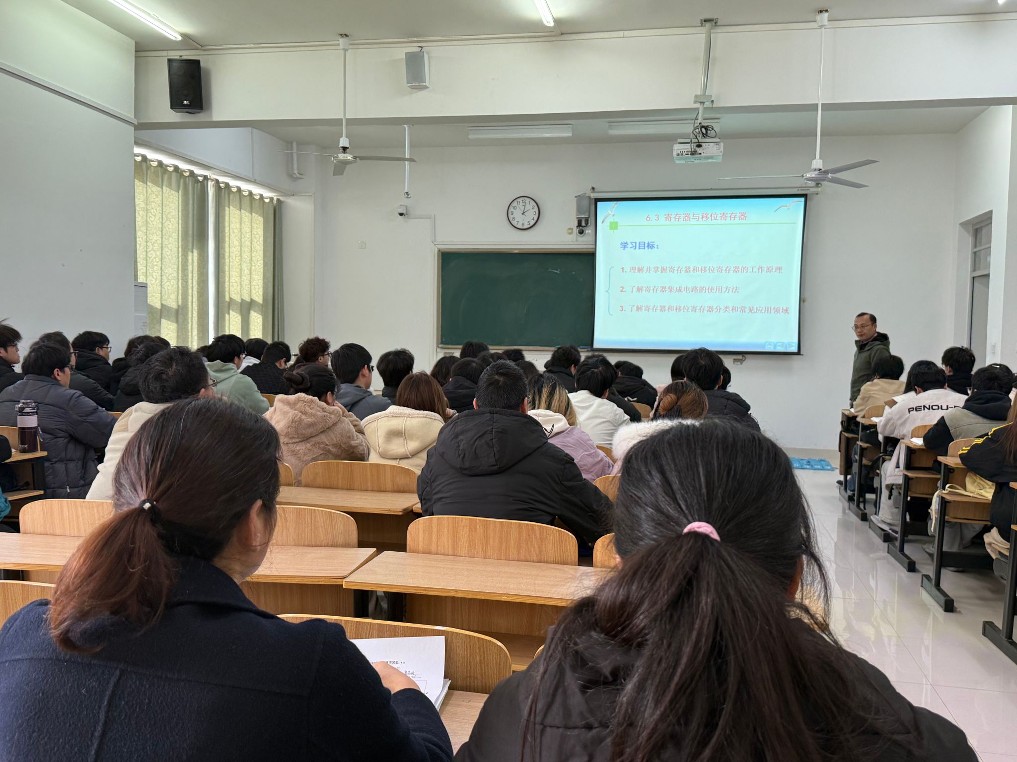 本次课程阐明寄存器本质是由N个触发器构成的同步阵列,其核心功能是在时钟节拍下,并行地存入、保持与输出一组N位二进制数据。课程强调,“所有触发器在同一时钟边沿动作,保证了数据的整体性存入;而并行输入输出则提供了极高的数据吞吐速率。” 为了实现对存入操作的精确控制,课程还深入讲解了带使能控制端(LOAD)的寄存器,通过数据选择器(MUX)智能地选择“加载新数据”或“保持原数据”,使其成为CPU中通用寄存器的理想模型。课程的进阶部分聚焦于移位寄存器,现场气氛达到了高潮。课程通过系统的理论讲解与生动的实例演示,深刻揭示了这两种电路在数据存储与数据处理方面的关键作用,为学生构建完整的数字系统知识体系画上了浓重的一笔,为后续《计算机组成原理》《微机接口技术》等课程的学习奠定了坚实的基础。