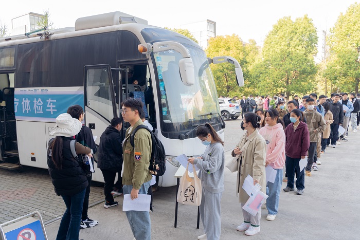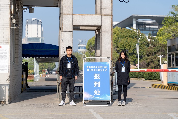 早晨7:30,体育馆正门入口处6个研究生培养学院设置的考生资格审查处一字排开,各体检项目按类别在体育馆内有序布置,校园西门口考生引导处工作人员持证就绪,迎接考生们的到来。