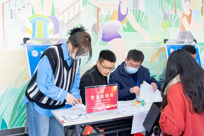 工作现场,还设置了党员先锋岗,一批2021级、2022级研究生党员志愿者投入到复试工作中,为考生答疑解惑。