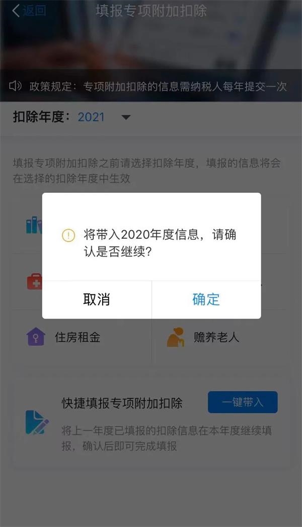 2.依据提示“将带入2020年度信息,请确认是否继续?”或者“您在2021年度已存在专项附加扣除信息,如果继续确认,将覆盖已存在的专项附加扣除信息!”,确认后点击“确定”。
