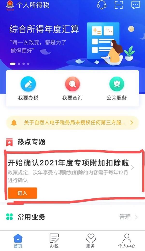 先确认之前申报的其他不需修改的专项附加扣除信息后,点击App首页专项附加扣除填报。
