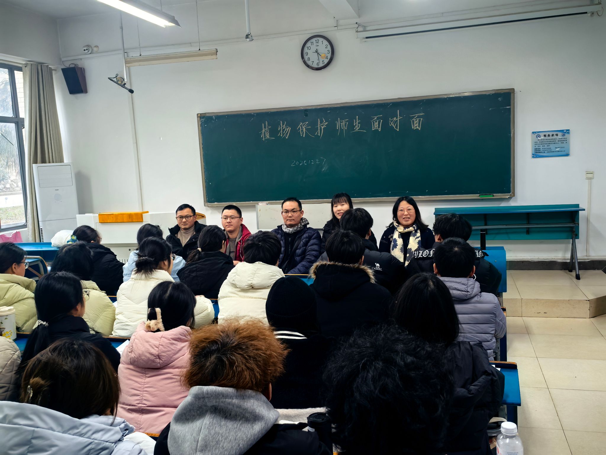 为深入践行“三全育人”理念,扎实推进学风建设,帮助植保学子明晰专业方向、做好学业规划,12月27日下午,农学院精心组织了一场“师生面对面”交流会。农学院植物保护系主任毕亚玲教授,教工党支部书记段海明副教授、杜军利副教授、张享享博士、吴志文博士等专业教师与2025级学生围坐一堂,围绕“专业知识学习、职业生涯规划、科研素养培养、考研就业选择”等展开了深入而热烈的交流,为学子们的成长之路“精准导航”。