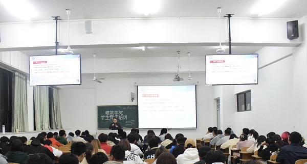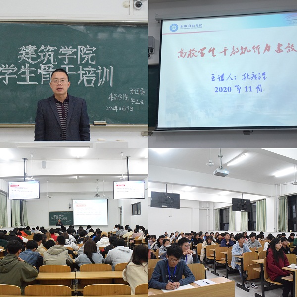 为进一步提高学生干部自我教育、自我管理、自我服务的能力和水平,增强学生干部的责任担当意识,推进学生工作扎实开展,建筑学院举办2020年学生干部培训班。11月19日晚,建筑学院学生干部培训班在致知楼A108举行,此次学生干部培训由建筑学院团委书记耿广汉主讲,建筑学院18级、19级、20级学生干部参加了培训。