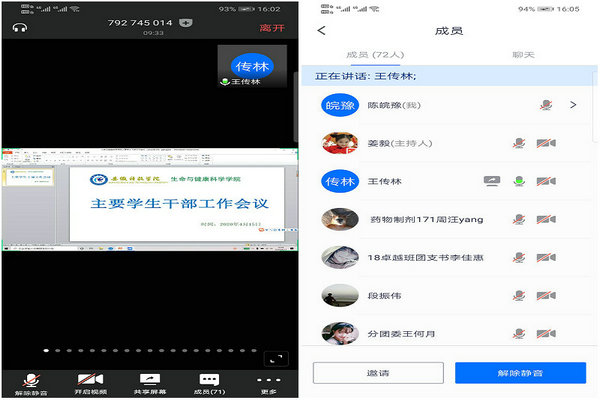 4月15日下午,生命与健康科学学院通过“腾讯会议”APP召开线上主要学生干部会议,学院分团委书记王传林、专职辅导员姜毅、刘国祥、非毕业班班长、团支书、学院分团委组织部成员、易班工作站负责人、学生会部长及以上成员连线参会,会议由姜毅主持。