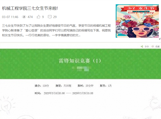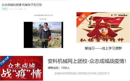 2月起,学院精心制作“众志成城战疫情、机械学子在行动”视频、积极推送各类疫情期间的典型人物和事迹,积极开展网上团校,开展“众志成城战疫情”、“3.5学习雷锋”线上主题培训,结合当前疫情形势,做好学生思想教育工作。