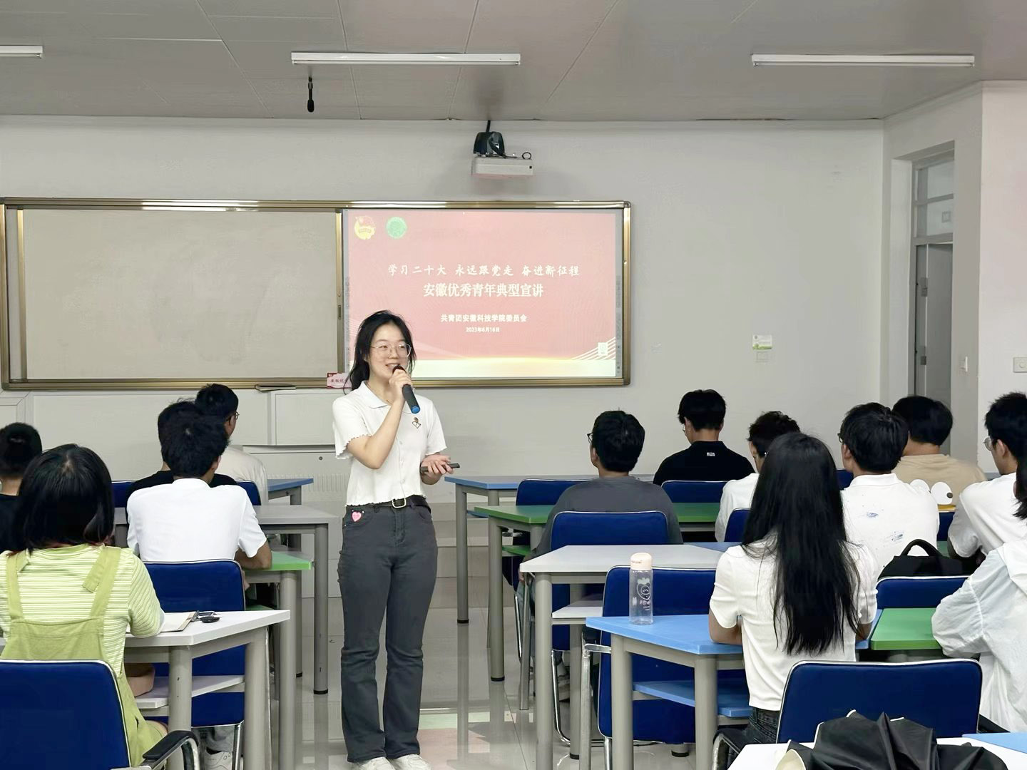 2022年安徽省优秀共青团员刘馨怡以《接力精神火炬,筑梦星辰大海》为主题,带领学生深入学习了习近平总书记给中国农业大学科技小院的同学们回信中充分肯定的“自找苦吃”的精神。宣讲由视频《立鸿鹄志做奋斗者——习近平对青年的殷殷嘱托》开场,围绕“追梦”、“担当”、“奋斗”三个关键词,列举了一系列榜样人物、先进事例,并结合自身在暑期返家乡开展社会实践活动取得的成果,向大家宣讲了“自找苦吃”精神的深刻内涵,希望大家以理想为风帆,以担当为使命,以奋斗为标杆,在“自找苦吃”中收获大有可为之“甘甜”。在讨论交流环节,刘馨怡围绕如何开展社会实践和更好学习专业知识学习两方面进行了经验分享,鼓励团员青年将自己所学的专业知识合理运用起来,为乡村振兴工作贡献青春力量。