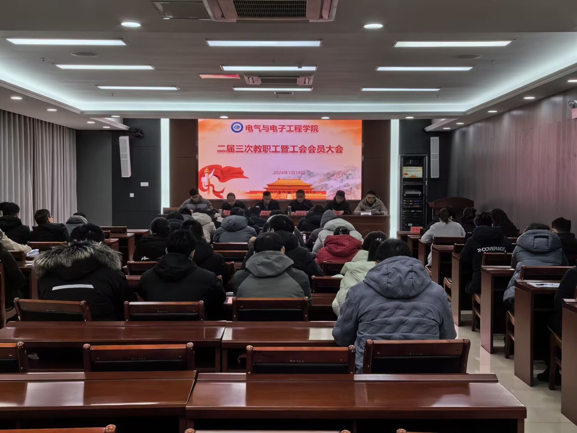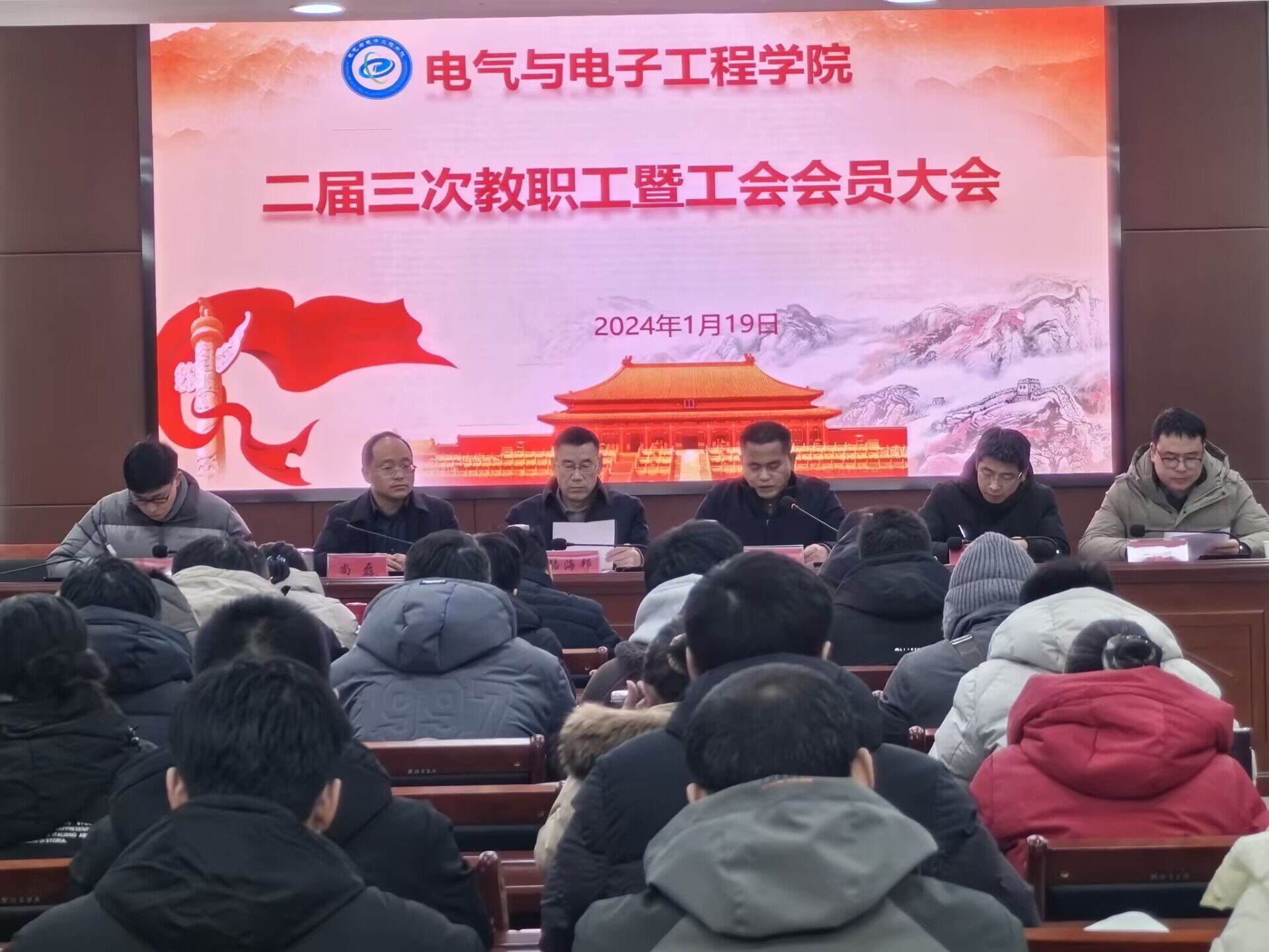 1月19日下午,电气与电子工程学院召开二届三次教职工暨工会会员大会,学院党委书记骆海邦,党委副书记、院长夏显明,党委副书记、纪委书记尚磊,副院长国海,副院长樊晓宇,全体教职工出席会议,会议由骆海邦主持。