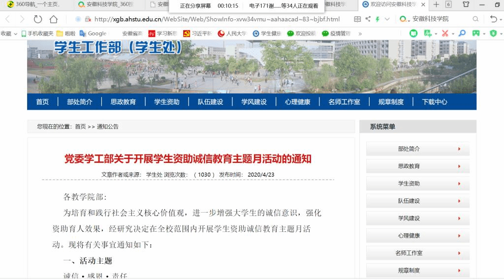 为进一步帮助大学生形成诚信意识,坚持育人导向,强化资助育人效果。5月10日上午,电气与工程学院通过线上屏幕共享形式召开学生资助诚信教育主题月活动暨资助委员培训会。学院各班级资助委员参加此次会议,会议由学院辅导员宋志华主持。