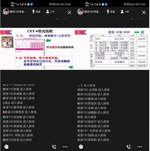 余薇薇、张一可向19级学生分享四级考试经验,他们向同学们介绍了大学英语四级考试的题型、分值以及各部分的时间安排,根据每一部分所占的分值,要求同学们去抓重点,此外,他们分别针对同学们提出的问题一一作答。董淑依、都木子结合自身备考经历向大家介绍CET-6备战经验,介绍考试的一些基本信息,然后分别对考试内容进行详细地介绍。对于听力、阅读、翻译、作文这四大类型题目,都给出了相关的学习建议和一些答题技。