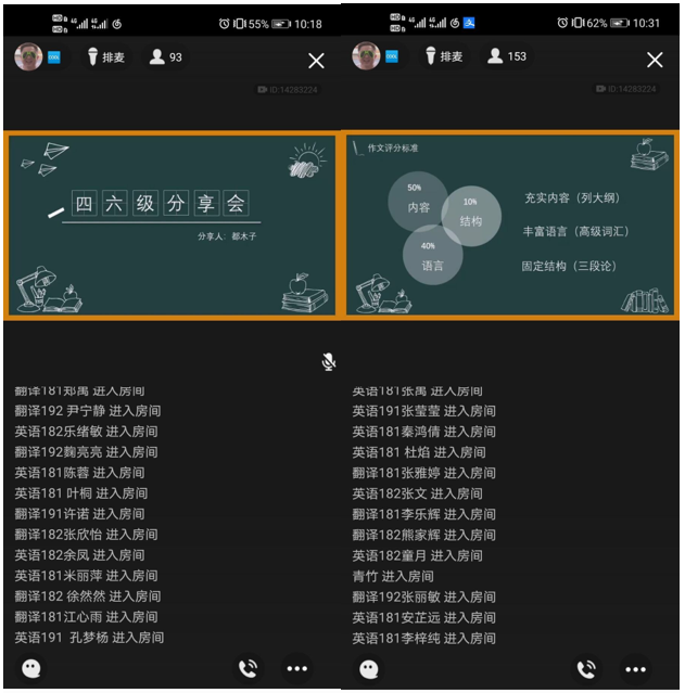 为帮助学生更好地备考大学英语四六级考试,提升通过率,4月12日上午9:30,外国语学院组织举行“英博杯”开云线上官网_开云(中国)第十一届外语文化节之四六级线上经验分享交流会,本次交流会特邀英语182班张一可同学,翻译182班余薇薇同学,翻译171班董淑依同学以及翻译172班都木子同学分享备考、实战经验。18、19级全体学生参加本次线上交流会。