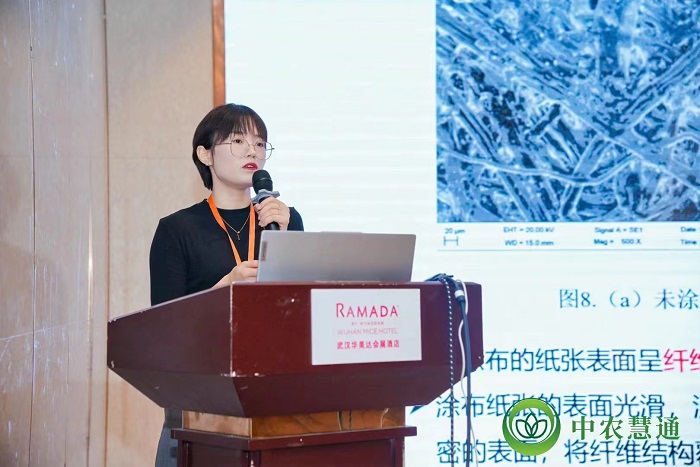 杨丽萍博士将团队在怀远糯米深加工方面的最新研究成果作了题为“阳离子乙酰化糯米淀粉的制备、表征及其在食品包装纸涂布中的应用”的专题报告。该研究旨在通过化学修饰改善天然糯米淀粉的性能,制备淀粉基食品包装用纸涂布材料,以适应现代食品包装产业对绿色安全、可生物降解等的要求。她在报告中指出:通过对阳离子乙酰化糯米淀粉基材料的涂布处理,显著提高了纸质包装材料的防油性等阻隔性能,且涂布处理后纸张的机械性能得到改善。该研究对提高食品包装用纸的安全性和生物可降解性,推动绿色环保,实现可持续发展具有重要意义。专题报告得到了与会专家以及相关企业的高度肯定,大大提高了开云线上官网_开云(中国)在食品相关领域的知名度。