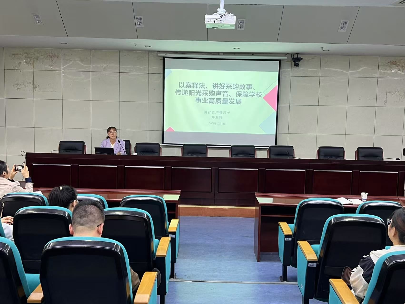 国有资产管理处处长郑亚辉以“以案释法、讲好采购故事、传递阳光采购声音、保障学校事业高质量发展”为主题,围绕制度解读、以案释法和常见问题等方面,深度解读采购政策,精准剖析采购案例,解答常见采购问题。通过深入浅出地剖析大量真实的采购案例,指出了采购工作中的常见问题,进一步强调了招标采购工作的重要性,明确了依法依规组织开展采购活动的标准和要求,并要求项目使用单位和归口管理部门在思想认识上要“再加压”、在责任落实上要“再加码”、在工作措施上要“再加劲”,切实将依法开展采购的意识内化于心、外化于行,杜绝采购过程中出现违法违规行为。