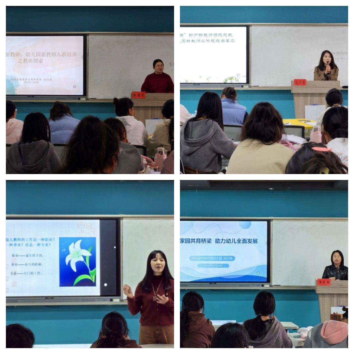 外国语学院周海平副教授围绕教育数字化与教师发展,分享了教育数字化相关研究、基础教育中数字化实践途径和常用的AI工具。凤阳县教师进修学校校长张雷强调教师应掌握备课、上课、听课、反思的基本方法,开启精进之路,尽快站稳讲台。马克思主义学院赵庆灿副教授强调教师应崇德修身,为人师表,做一名党和人民满意的好老师。凤阳县教育体育局教研室学前教育教研员赵雪莲主任开展了题为“新起点,新教研:幼儿园新教师教研探索”的专题讲座,围绕幼儿园教研的概念、园本教研的内容、优秀教研案例分享及县域教研的实施。